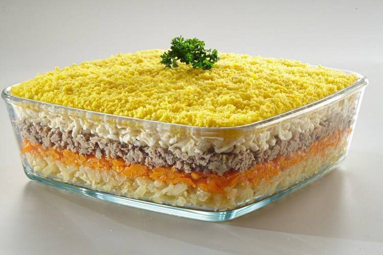 Салат «Мимоза» 📖 Ингредиенты: - Консервированная рыба в масле – 1 банка - Отварной картофель – 2 шт. - Отварная морковь – 2 шт. - Яйца вкрутую – 5 шт. - Твёрдый сыр – 150 г. - Лук – 2 шт. - Майонез, соль - по вкусу. 🧑🏻🍳 Приготовление: 1. Отделите белки от желтков, и натрите белки на мелкой терке. После этого равномерно выложите их в глубокую тарелку – это и будет первым слоем салата. Смажьте его майонезом. 2. Далее натрите на тёрке сыр, выложите его на белки – 2й слой. Затем – майонез. 3. Третьим слоем будет рыба, которую нужно предварительно размять вилкой. Не забывайте про майонезную прослойку. После этого пришла очередь нарезанного и ошпаренного (чтобы не горчил) лука. Затем – слой майонеза. 4. Натрите картофель, после чего уложите его следующим слоем. На картофель положите оставшуюся рыбу, хорошенько размятую вилкой. 5. Смажьте майонезом. Натрите на мелкой терке желтки, посыпьте ими салат. Добавьте немного мелко нарезанной зелени. #салат #мимоза #салатмимоза