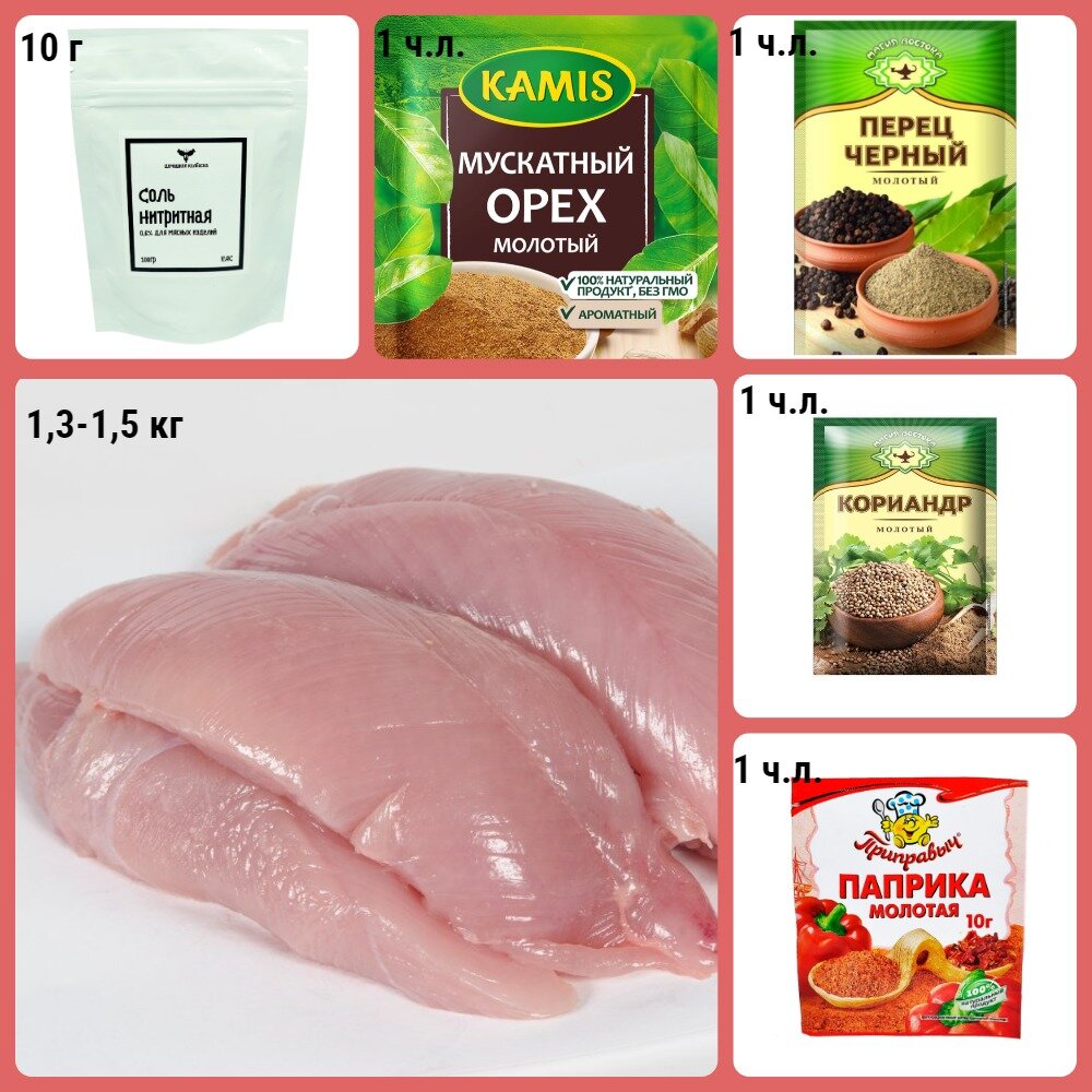 Для приготовления домашней ветчины нужно не так-то и много, мясо, рукав для запекания и ветчинница. Если ее нет, то просто туго закручиваем рукав, но плотность готового продукта будет пониже, конечно. Кусочек занудства Знаю, что многие готовят подобную ветчину в пластиковых бутылках или тетрапаках, но это чрезвычайно не полезно! Эти упаковочные материалы не предназначены для нагрева! В отличии от специального полиэтилена, который выносит нагревание до высоких температур. Нам понадобятся следующие продукты, и да, количество специй конечно можно уменьшить,а состав изменить. Количество мяса в расчете на стандартную ветчинницу (фото в галерее) Калорийность готового продукта по сути равна калорийности мяса, из которого вы будете делать ветчину. Шаг 1 Самый нудный. Нарезать мясо маленькими кусочками около 1 см, можно чуть меньше или чуть крупнее. Не старайтесь резать прямо одинаковые, лучше немного разные, будет прочнее спрессовываться. Шаг 2 Добавляем специи и перемешиваем. Нитритная соль н