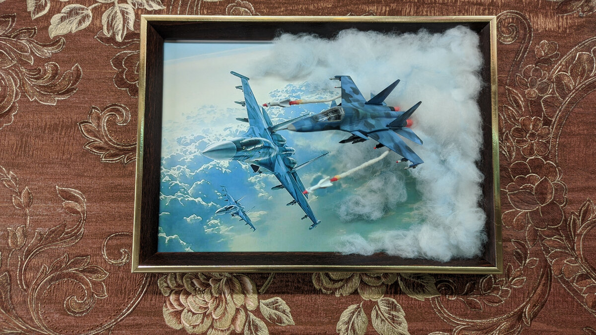 Новый опыт всегда полезен. Попросили изготовить подарок макет самолёта Су-34 . Раньше никогда не имел дело с самолётами, так что не пинайте сильно. Было решено сделать в таком виде (раньше видел нечто подобное в интернете). Склеил, загрунтовал. Красил красками "Exmix". Далее распечатал подходящее фото на формате А4 ну и прикинул положение модели. Облака было решено делать из пуха т.к. синтепон слишком грубый для этих целей. Далее всё закрепляем всякими клеями и немного подкрашиваем аэрографом облака голубым и слабо серым цветами . Очень понравилось работать с самолётом. Наверное, ещё сделаю несколько разных самолётов и обязательно попробую с подсветкой. Всем добра ...