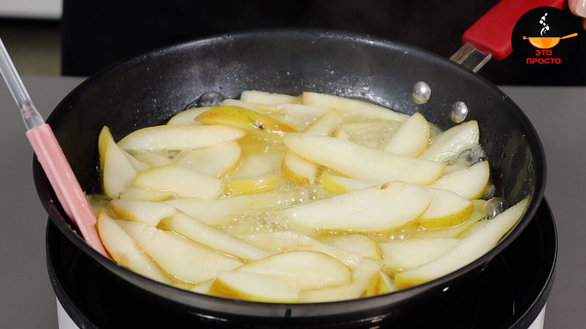 Сегодня готовим пирог с грушами. Сочные кусочки груш и ванильное, нежное тесто – идеальное сочетание августа для семейного чаепития! Попробуйте, это очень вкусно! СПОСОБ ПРИГОТОВЛЕНИЯ: Начнём приготовление с груш. Не очищая от кожуры, нарезаем их на ломтики потолще. В сковороду кладём буквально 20 г сливочного масла, груши и 50 г сахара. На умеренном огне томим груши в течение 5 минут. Какой же сливочно-грушевый аромат у меня на кухне – вы себе просто не представляете! Даём грушам остыть, а в это время займёмся тестом. К 3 яйцам добавляем щепотку соли, 100 г белого сахара и 10 г ванильного сахара. Взбиваем до посветления и пышности. Теперь скорость миксера делаем минимальной и вливаем 100 мл молока комнатной температуры, а также 100 мл растительного масла без запаха. Кстати, вместо молока можно взять кефир или несладкий йогурт. В другой миске соединяем 200 г просеянной муки и 12 г разрыхлителя (2 ч.л. с горкой). Высыпаем сухие ингредиенты в жидкие и на низкой скорости миксера соединяе