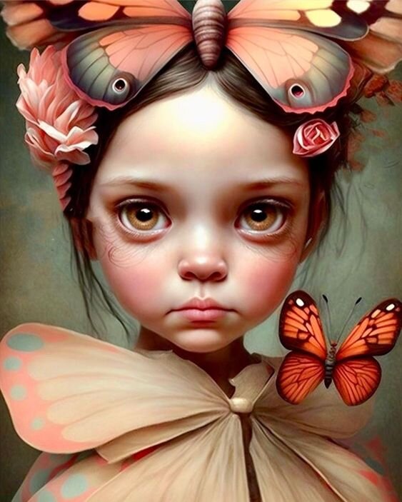 Платье на Марусе розовое в горошек. Волосы украшены цветами оттенка пудры. Спереди на голове, как корона, сидела бабочка. С темными ободочками по краю крыльев. А на платье в виде воротника, ещё одна - под цвет платья, с белыми полосами и зелеными кружочками на поверхности крыльев.