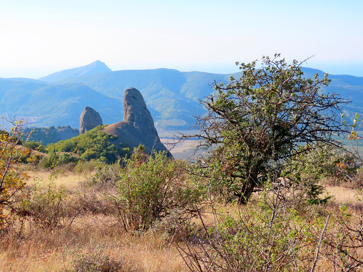 Начало - Часть 1. По виноградной долине. Часть 2. По горе Амбулампа. Часть 3. Мы на вершине! Часть 4. Вечерняя прогулка. Часть 5. Рассвет в горах. После завтрака, собрали палатку и сложили все вещи по рюкзакам. Сегодня прогулка к Рожкам! К мечте! Оставили рюкзаки, сложив под небольшое деревце и пошли. Это только кажется, что они совсем рядом. По правильному, как на картах, это гора называется Чатал-Кая, что в переводе обозначает скала-рогулька. В основном принято называть – Два брата. По этому поводу есть очень грустная легенда. И совсем редко называют – Кошка. Из-за схожести с ушами кошки, наверное. Ну и еще одно название – Чертовы рога. А мы с Мишей их называем просто Рожки. Вообще- то по Крыму много скал с таким названием. Отвлеклась! Идём на Рожки! Хотела найти данные по высоте этих скал, но везде указана только высота самой горы – 260 метров. Снова спускаемся вниз по тропинке, где вчера вечером нагуливали аппетит. Надо смотреть под ноги, но не получается. Слева загадочные рисунки