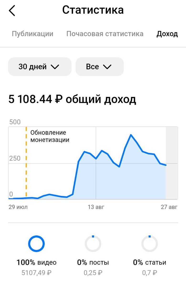 Ну что сказать. В августе в Дзене обновилась монетизация. Считаю, что сделали правильно. Деньги не за подписчиков, а за вовлеченность в контент. Не сказать, что я прям веду Дзен. Но несколько месяцев назад решил заливать клипы не только в ТикТок, но и дублировать их здесь. Сколько я заработал за месяц? Такое себе развлечение, скажут многие. Но я был приятно удивлен, когда несколько роликов прям «залетели» и принесли доход. Доход, конечно, символический, хотя за 30 дней я получил 5108 российский рублей. Казалось бы вообще ни за что. Но приятно, что Дзен, в отличие от ТикТока платит за просмотры. Еще удивился, что без труда привязал белорусскую кару Visa и вывел в общей сложности 171 белорусский рубль. Вывод занимает минут 5-10. То есть после заявки деньги уже были на карте практически мгновенно. Удивительно, как можно заработать просто на роликах. Сейчас вот гляну, сколько принесет эта короткая статья. Всем добра!