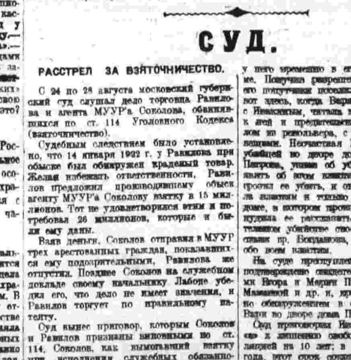СУД. РАССТРЕЛ ЗА ВЗЯТОЧНИЧЕСТВО. С 24 по 28 августа московский губернский суд слушал дело торговца Равилова и агента МУУР’а Соколова, обвинявшихся по ст. 114 Уголовного Кодекса (взяточничество). Судебным следствием было установлено, что 14 января 1922 г. у Равилова при обыске был обнаружен краденый товар. Желая избежать ответственности, Равилов предложил производившему обыск. Агенту МУУРа Соколову взятку в 15 миллионов. Тот не удовлетворился этим и потребовал 26 миллионов, которые и были ему даны. Взяв деньги, Соколов отправил в МУУР трех арестованных граждан, показавшихся ему подозрительными, Равилова же отпустил. Позднее Соколов на служебном докладе своему начальнику Лабоде убедил его, что дело не имеет значения, и Равилов торгует по правильному патенту. Суд вынес приговор, которым Соколов и Равилова признаны виновными по ст. 114. Соколов как вымогавший взятку при исполнении служебных обязанностей приговорен к высшей мере наказания, т.-е. к расстрелу. По отношению же к Равилову с