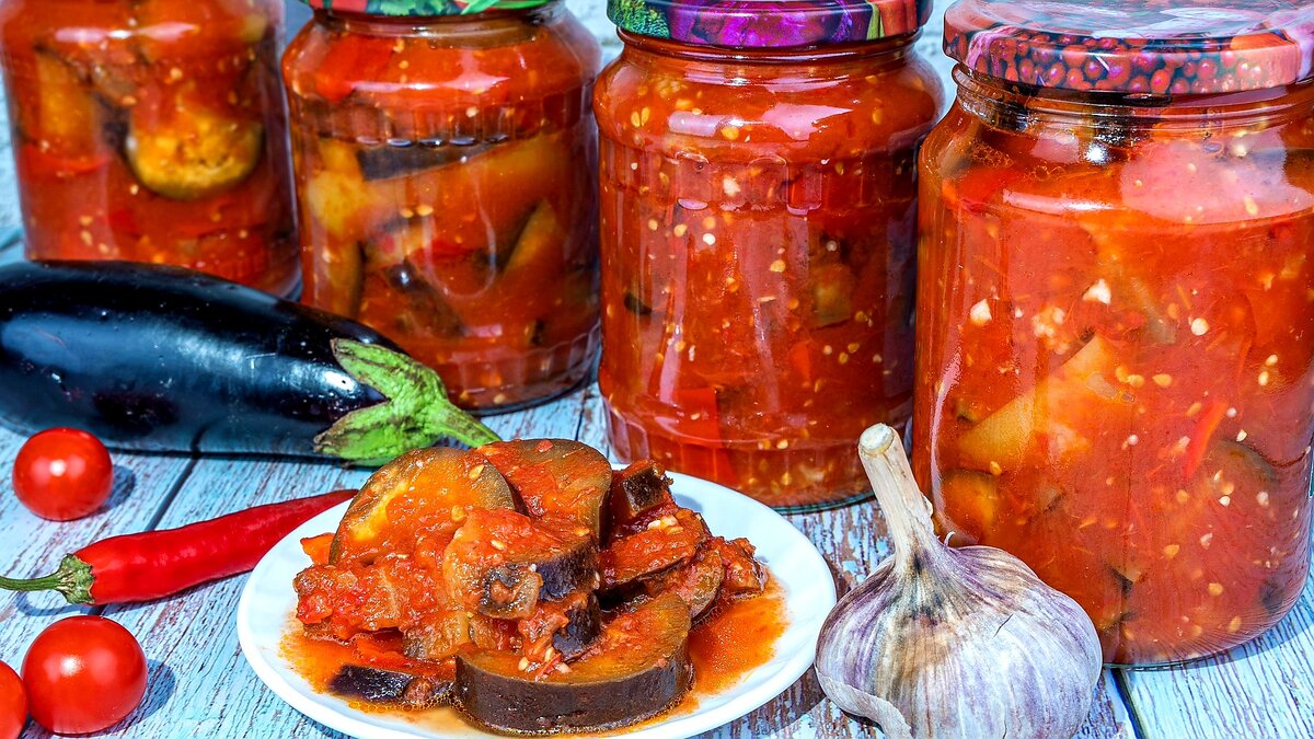 Тебе понадобится: 1,5 кг баклажанов, 1,5 кг помидоров, 1 кг болгарского перца, 1 головка чеснока, 150 мл растительного масла, 1 ст.л. соли, 4 ст.л. сахара, 70 мл уксуса, по 1 пучку петрушки, кинзы и укропа. Приготовление: Очисти помидоры от кожицы, пропусти через мясорубку и добавь масло, соль и сахар. Доведи до кипения и добавь произвольно нарезанные баклажаны и болгарский перец. Протуши еще 15 минут и добавь рубленую зелень и чеснок. Еще через 5 минут влей уксус и закатай баклажаны в стерилизованную банку.