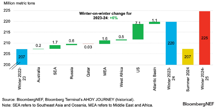 Природный газ из США чище и дешевле российского, и его использование позволит значительно сократить выбросы CO2, считает Спикер Палаты представителей Конгресса США Кевин МакКарти. Прогноз BloombergNEF по изменению мирового предложения СПГ по регионам мира и миру в целом зимой 2023–2024 годов в млн тонн. Последние два столбца — аналогичный прогноз на лето 2024 года (желтым) и зиму 2024–2025 годов Спикер Палаты представителей Конгресса США Кевин МакКарти планирует рекламировать американский СПГ на встрече со спикерами парламентов стран G7 в Японии. Об этом политик сообщил в воскресенье в эфире FOX News. «Если мы заменим российский природный газ американским в одной только Европе на один год, то мы сократим выбросы CO2 на 218 млрд тонн, так как наш природный газ чище», — отметил МакКарти. — «Наши цены были бы ниже, Америка стала бы экономически сильнее, а мир — безопаснее». Этой зимой мировое предложение СПГ увеличится на 6% г/г до 220 млн тонн, прогнозирует BloombergNEF. Аналитики компан