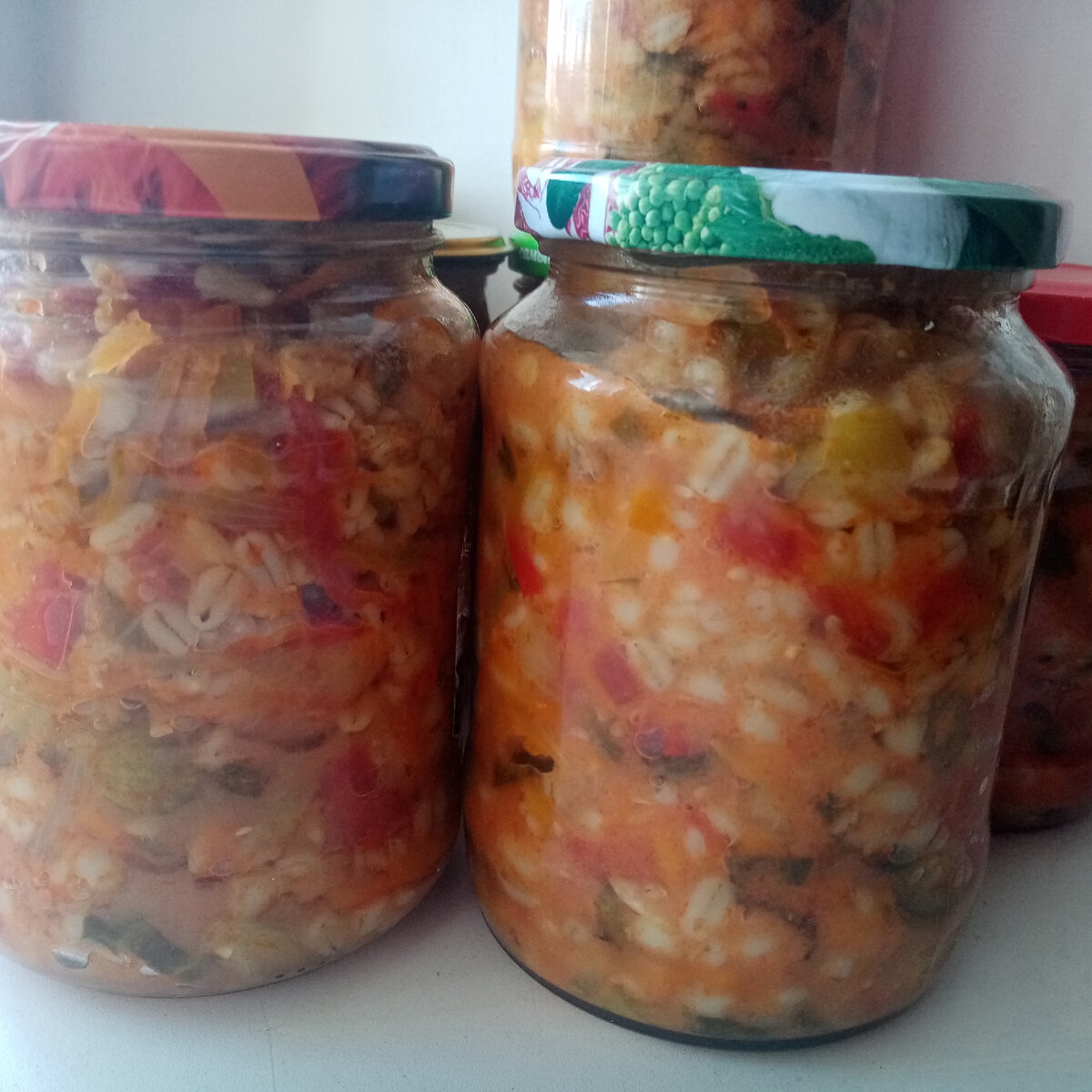 Для заготовки я беру: -Огурцы свежие- 1 кг -Томаты - 1 кг -Перец болгарский- 750 грамм -Морковь- - 500 грамм -Перловая крупа - 400 грамм -Лук репчатый - 400 грамм -Масло растительное 1/2 стакана -Соль - 5 столовых ложек без верха -Сахар- 1 столовая ложка -Черный молотых перец- 1/2 чайной ложки -Лавровый лист - 3-4 листика -Куркума - 1/2 чайной ложки -Колечко острого перца по желанию -Уксус 70 % - 2 неполные столовые ложки Вес всех овощей указан в подготовленном виде Приготовление: 1. Овощи мою и чищу, взвешиваю. С томатов снимаю шкурку,чтобы не плавала потом в готовом супе. 2. Измельчаем овощи. Огурцы нарезаю соломкой (можно натереть на крупной терке), перец болгарский и томаты мелкими кубиками (можно пропустить через мясорубку), лук ши