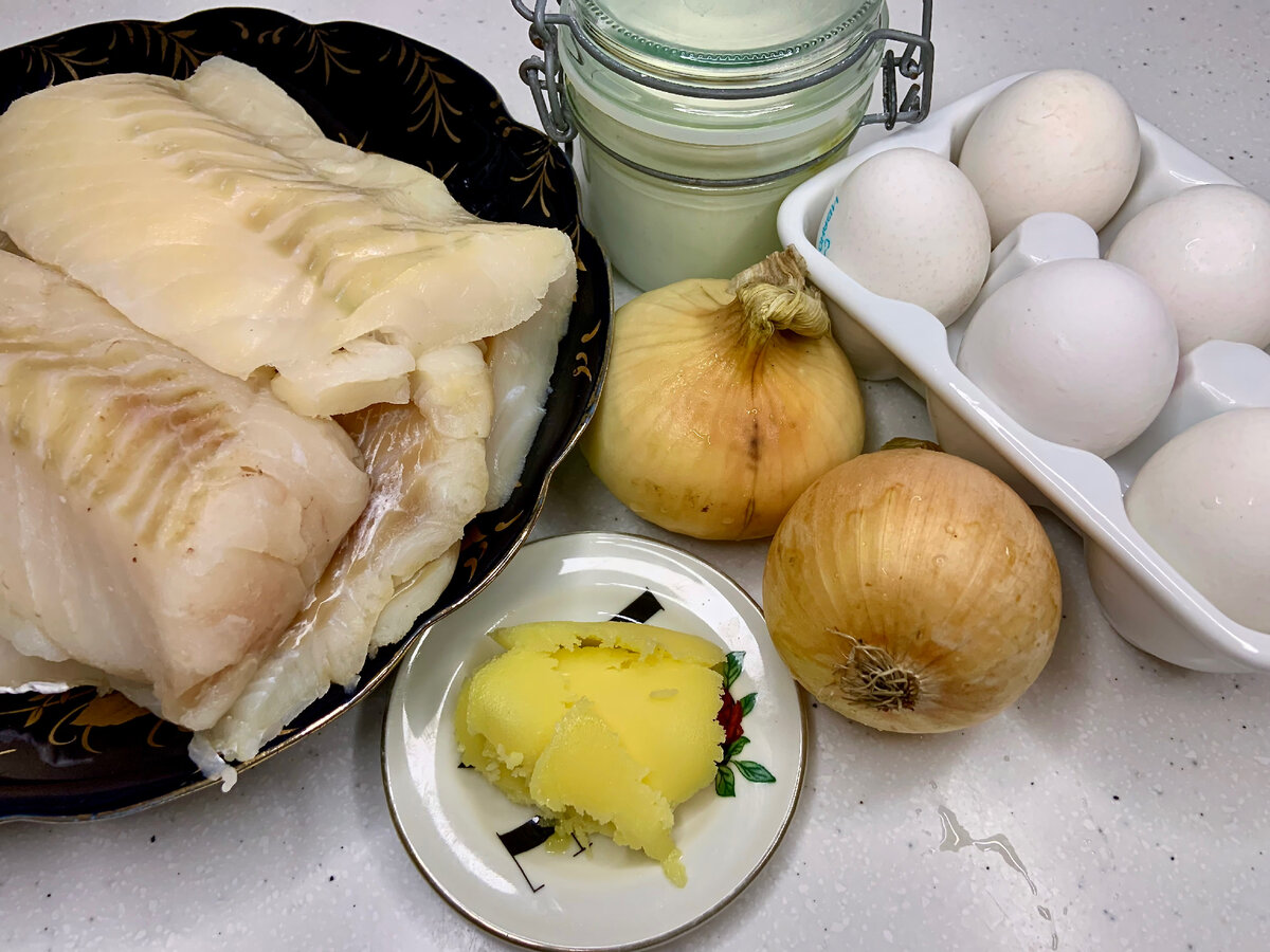 Этот рецепт мне достался из семьи - моя мама так готовит, а готовит она прекрасно. Он с одной стороны прост, а с другой стороны сложен количеством ингредиентов. Но поверьте, он очень разнообразит ваше рыбное меню. Не буду напоминать, что многое зависит от рыбы, вкусная рыба - залог успеха. Рецепт майонеза найдете у меня в подборке, здесь уже не стану его дублировать. Приготовьте его первым, заодно будете понимать насколько он соленый и как солить рыбу. На гарнир я подавала с салатом "битые огурцы". Его ждите в следующем рецепте. Начнем? Вам понадобится: на 6 порций 1. Заранее готовим майонез. Моем яйца, кладем в холодную воду, добавляем соль, ставим на огонь и доводим до кипения. Варим 10 минут. По истечении времени ставим под холодную воду охлаждаться. Пока варятся яйца размороженную треску обмакиваем бумажными полотенцами, дабы убрать лишнюю влагу. 2. Разрезаем рыбу на 6 более менее равных частей, солим и перчим со стороны где была кожа. Пальцами втираем соль с перцем по поверхност