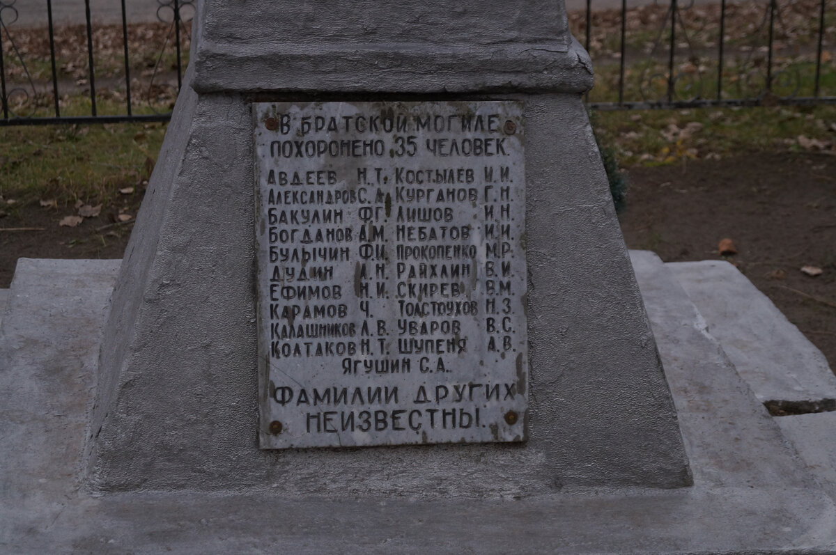 Если убрать фамилии, ошибочно написанные на памятнике, то всего получается 34 человека, очень близко к официально заявленному, согласно паспорта памятника.