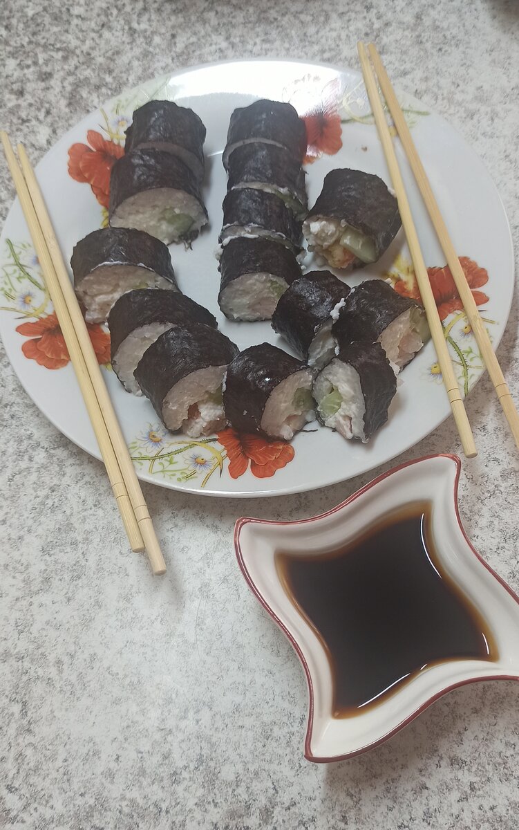 Ингредиенты: Рис круглозерный - 200гр. Вода - 300мл. Листья нори (для этой порции 6 штук) Рисовый уксус - 20мл. Соль - 0,25 ч.л. (для риса) Соль - 1 ст.л. (для креветок) Сахар - 0,25 ч.л. Креветки - 700гр. Творожный сыр Ricotta pretto - 200гр. Огурец - 2-3 шт. небольшого размера. Соевый соус "San bonsai" без глютена. Приготовление . Промыть рис водой, залить водой, поставить на огонь, как воды не останется, выключить и покрыть полотенцем, чтобы лишняя вода впиталась. Оставить на 15 минут. Промыть креветки. Поставить варить кревеветки. Положить их в кастрюлю, залить водой, посолить, можно добавить сушенные семена укропа. Довести до кипения и подождать 3 минуты. Выключить огонь и оставить настояться в воде, чтобы они были более сочные. Порезать огурец. В рисовом уксусе растворить соль и сахар. Вылить в рис уксус, перемешать. Взять лист нори, отрезать от него четверть листа и на большую часть выкладываем рис, оставляя край листа для склеивания. Далее кладём сыр, креветки и огурец. Пото