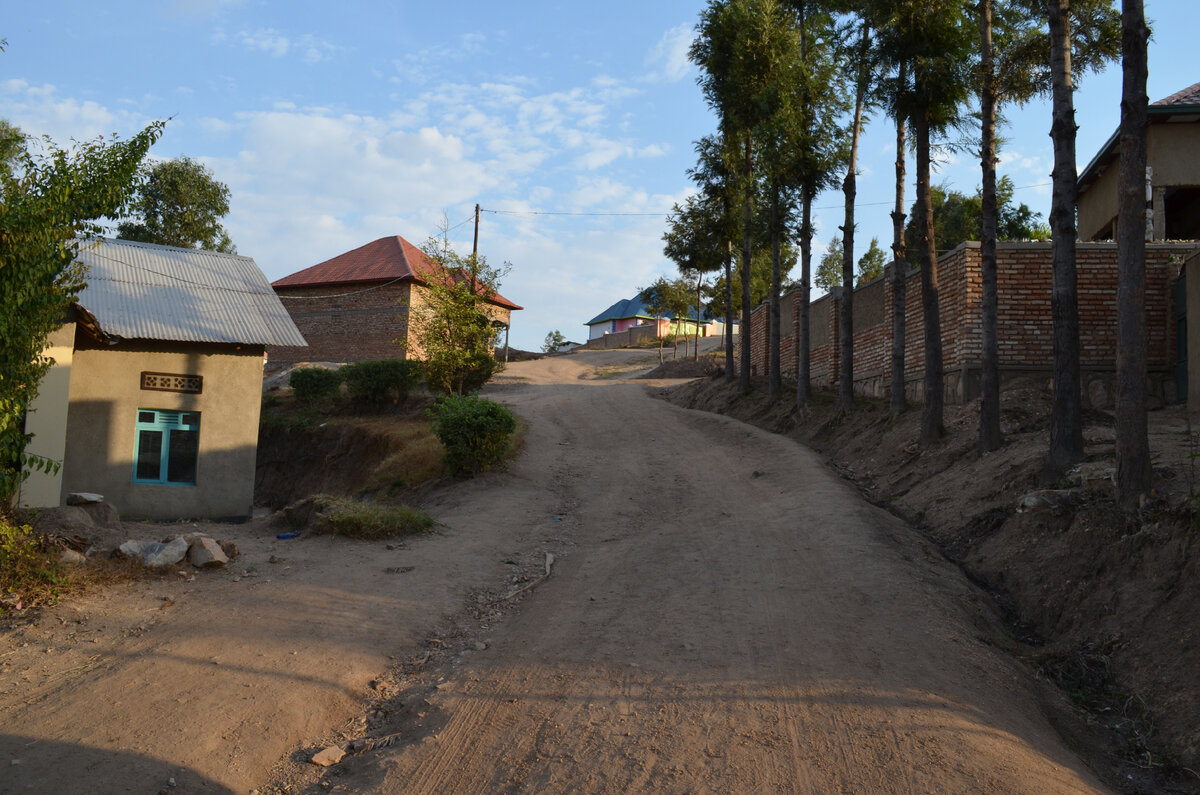 Грунтовая улица в Руандийской деревне. Банановые плантации рядом с домом. Козы... Саманные домики. Эти саманные дома отштукатурены цементом. Чистая одежда, опрятный внешний вид. Детям повезло родиться в хорошей семье. И не против сфотографироваться. Они даже не просили у нас деньги. Новая постройка. Неплохо, неплохо... Дом справа уже из кирпича. Зажиточный крестьянин) На вершине холма дома получше. И снова бананы. Это зелёный сорт, их жарят либо варят в качестве основной пищи. Хорошо придумали. Высокие кусты в качестве живой изгороди. Мне нравится такой подход. Бедно, но со вкусом. Великолепный пейзаж... ... Здесь даже телевидение есть. Из дома доносится трансляция футбольного матча. Ещё один кустарник. А это я, пытаюсь позировать. Но у жены получается лучше. Всё это растёт круглый год. Помощница Страна тысячи холмов... Кустарники справа - это кассава (маниок). Внизу поля где выращивают картошку, батат и кассаву. А вот и капуста. Другой ракурс. Здесь сушат кукурузу. Возможно девочка
