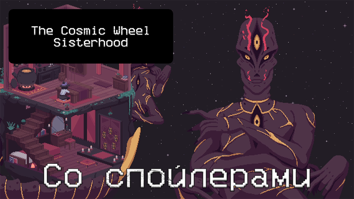Обзор на недавно вышедшую новеллу The Cosmic Wheel Sisterhood я писал уже ранее, сейчас я бы хотел высказать свое мнение. Если вам хочется ознакомится с игрой, с основными аспектами без спойлеров, то вот статья. А в данное статье будет рассмотрены сюжетные моменты ближе к концу игры, где невозможно без спойлеров. Ведьма в изгнании Фортуна впав в одиночества и отчаяние призывает древнее существо – Левиафана. Они заключают договор, поле чего Фортуна проходит обучение и создает свою колоду предсказаний (аналог Таро). В самом начале знакомства Фортуны и Левиафана Абрамара задается вопрос, чем готова пожертвовать наша героиня, выборы: