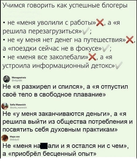 Время диктует свои правила, как там раньше на Американском Юге говорили? Упоминание имени леди в газетах допустимо три раза: 1) Родилась. 2) Вышла замуж. 3) Окончила свой жизненный путь. Каждый блогер это своего рода газета, а многие пишут про себя ежедневно. Вы умеете преподносить контент, как делают это успешные блогеры? Давайте учиться вместе: Словосочетания то какие все красивые: "я решила выйти из общества потребления и посвятить себя духовным практикам", блин!!!! Я в это общество и войти то ни как не могу! А вот свод правил для барышень: Пыталась проникнуться, но так и не поняла, чем мои любимые грибы не угодили??? Как вам такие правила, кто Вы: успешный блогер или барышня? Картинка для превью. Берегите себя и спасибо, что читаете. Подписывайтесь на мой канал: Предпенсионерка