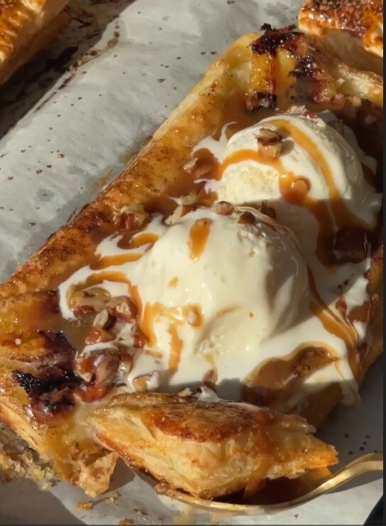 Нежная хрустящая выпечка может легко превратиться в изысканный десерт. Готовим просто и наслаждаемся! Фрукты можно использовать разные - яблоки, сливы, персики и т.д. Мои пробные перевёртыши - с бананами 🍌🍌🍌 Делюсь вкусным рецептом. Готовим из слоёного бездрожжевого теста, количество использованных продуктов в конце статьи. Поехали! ✔️ Включаю духовку, выставляю 200°C. ✔️ Тесто я оставила в холодильнике с вечера и утром достала размороженное, чтобы на завтрак порадовать любимых едоков. ✔️ Растопила сливочное масло. ✔️ Порубила помельче орехи пекан (можно заменить на любые другие) ✔️ Очистила бананы и разрезала их вдоль по 2 шт. на каждый прямоугольник теста. ✔️ Разделила размороженный пласт теста на 4 равных прямоугольника. ✔️ Застелила противень пергаментом, обильно смазала маслом, сверху слегка присыпала сахаром и корицей ✔️ Выложила бананы срезом вниз и накрыла прямоугольником теста. Края примяла вилкой, смазала слойки желтком и снова слегка посыпала сахаром 👇👉 ✔️ Выпекала