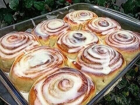 Безумно вкусные булочки Синнабон 👍 📋 Тесто: 🍚 Молоко - 200мл 🍚 Мука - 500-550гр 🍚 Дрожжи - 1ч ложка 🍚 Слив.масло - 75гр 🍚 Сахар - 75гр 🍚 Яйца - 2шт 🍚 Соль - 1ч ложка 📋 Начинка: 🍚 Сахар - 120гр 🍚 Корица - 15гр 🍚 Слив.масло - 90гр 📋 Глазурь: 🍚 Маскарпоне - 200гр 🍚 Сахарная пудра - 100гр В тёплое молоко добавить столовую ложку сахара и дрожжи, перемешать и оставить на 10-15 минут. Мягкое слив.масло взбить с сахаром, по одному вести яйца взбивая до однородности. Добавить дрожжи, соль и хорошо перемешать. Теперь добавляем 500гр (+ 50гр, не больше) муки и вымешиваем 10 минут мягкое тесто, дать подняться час. Сахар, корицу перемешать. Поднявшееся тесто раскатываем, складываем конвертиком и оставляем ещё на 15 минут. Раскатываем тесто в прямоугольник толщиной не больше 5 мм, смазываем слив.маслом, посыпаем сахаром, закручиваем в рулет. Нарезаем на небольшие кусочки(получится приблизительно 12штук), складываем в смазанную форму, оставляем 15-20 минут для расстойки и печем п