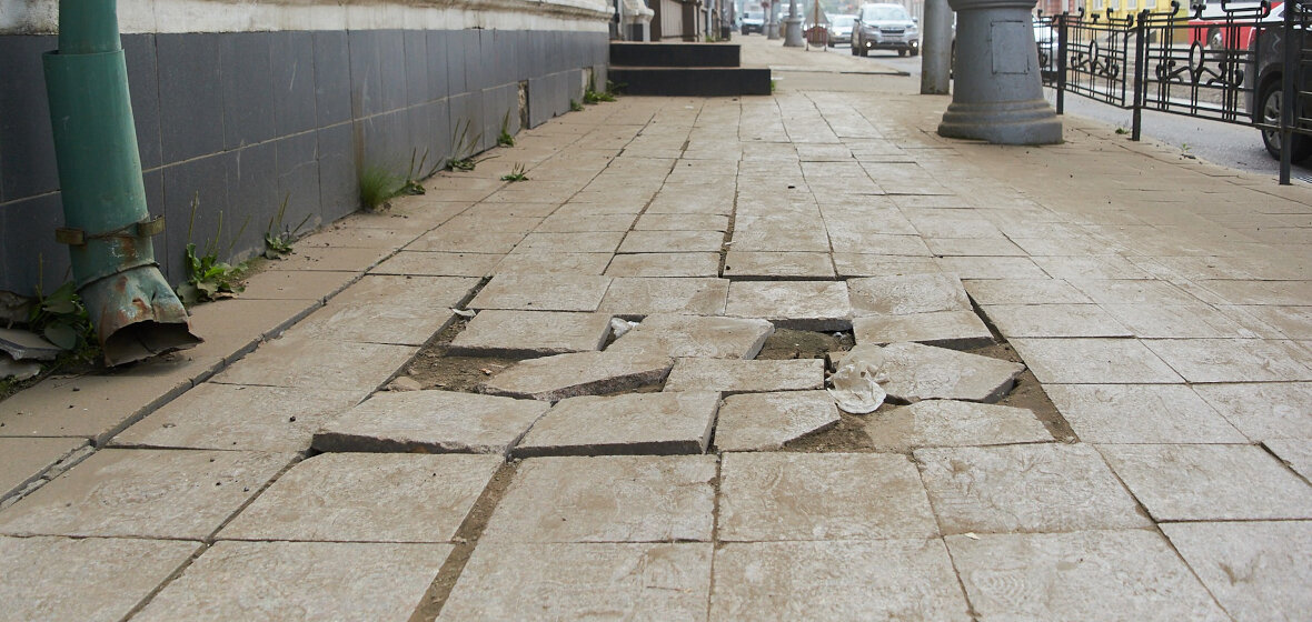 Тротуар на одной из главных улиц города находится в очень плохом состоянии. Между тем, гранитную плитку на Ленина положили в 2011 году, и тогда городские власти заявили, что можно забыть о ремонте тротуара как минимум на сорок лет; однако, как мы видим, плитка дала, так сказать, трещину намного раньше. И если в том, что плитка ходит ходуном и проваливается, виновато качество ее укладки (ошибки при монтаже), то в том, что она расколота, — машины. Как рассказывают местные жители (да и мы увидели это сами), частенько водители оставляют свои авто прямо на тротуаре; здесь же, возле магазинов, паркуются и грузовики. Не удивительно, что даже гранитная плитка не выдержала!