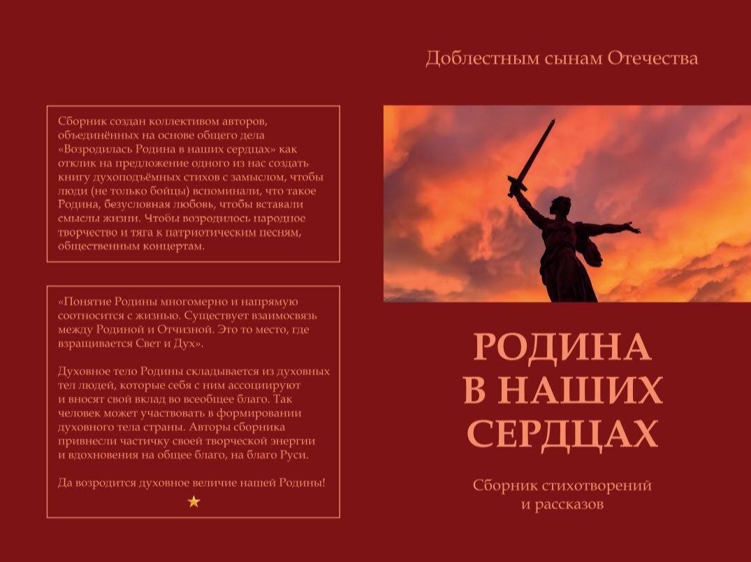 Сегодня мы хотим поделиться удивительной историей соратников о том, как важно объединяться ради одной общей цели. Ребятам в короткий срок совместно удалось явить сборник стихов о Родине, где каждый вложил свою частичку света✨ От создателей: В апреле этого года возникла идея сделать сборник с патриотическими стихами, который бы послужил фундаментом для появления песен о Родине, патриотических концертов, возрождению истинной культуры. Идею надо было реализовать, так как в этой плотности всё делается руками людей через людей, и мы стали реализовывать. Бросили клич в общественные группы Сорадения, чтобы те соратники, которые пишут стихи, откликнулись и присылали свои творения для общего дела. Довольно быстро удалось набрать необходимое количество стихов для сборника. Отбор производился на основе чистоты, то есть без наличия чувственного плана и духа войны в стихах. Произведения должны были пробуждать Дух у читающих, побуждать их к высоким стремлениям, к Свету✨. Далее следовал