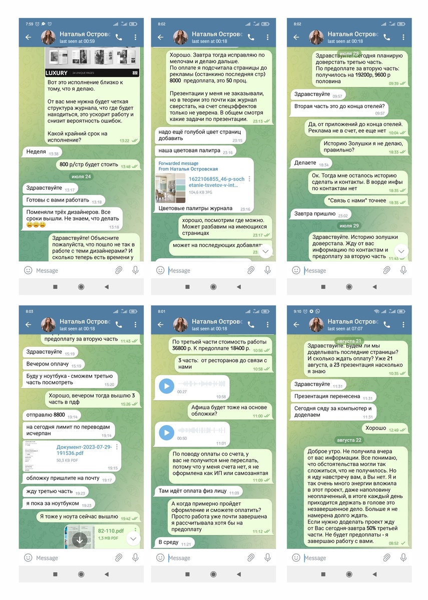 В общей сложности она не оплатила мне за работу 54 000 р. (из 71 200 р.) Труд должен оплачиваться, а если нет возможности оплачивать, то не стоит вести подобные дела. Тем более выбор дизайнеров на Авито (где она и обратилась) на любой кошелек и вкус.