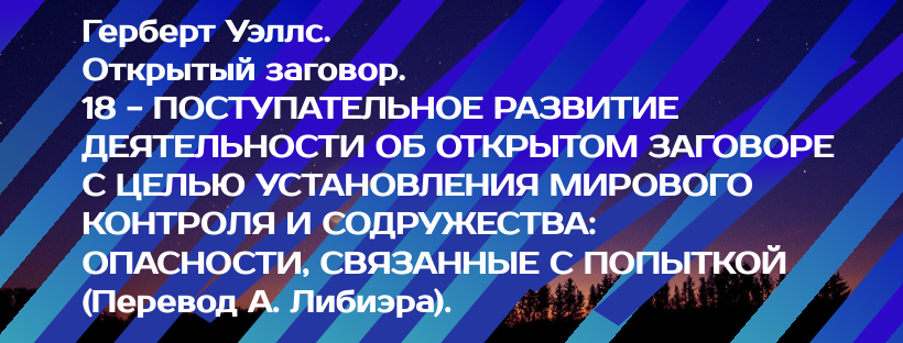 конкуренции, но по мере того, как происходит слияние атлантических государств, возрастает возможность и необходимость установления мирового контроля над областями плохого управления и беспорядка. Великая война, подобная войне 1914-1918 годов, может никогда больше не повториться. Здравого смысла человечества может быть достаточно, чтобы предотвратить это. Но человечеству предстоит еще много реальной войны, на границах повсюду, против разбойников, против древних привязанностей и традиций, которые в конце концов станут не более чем оправданиями для разбоя и препятствования взыскания. Весь вес Открытого Заговора будет на стороне мирового порядка и против такого рода местной независимости, которая удерживает подвластных ей людей от гражданства мира.