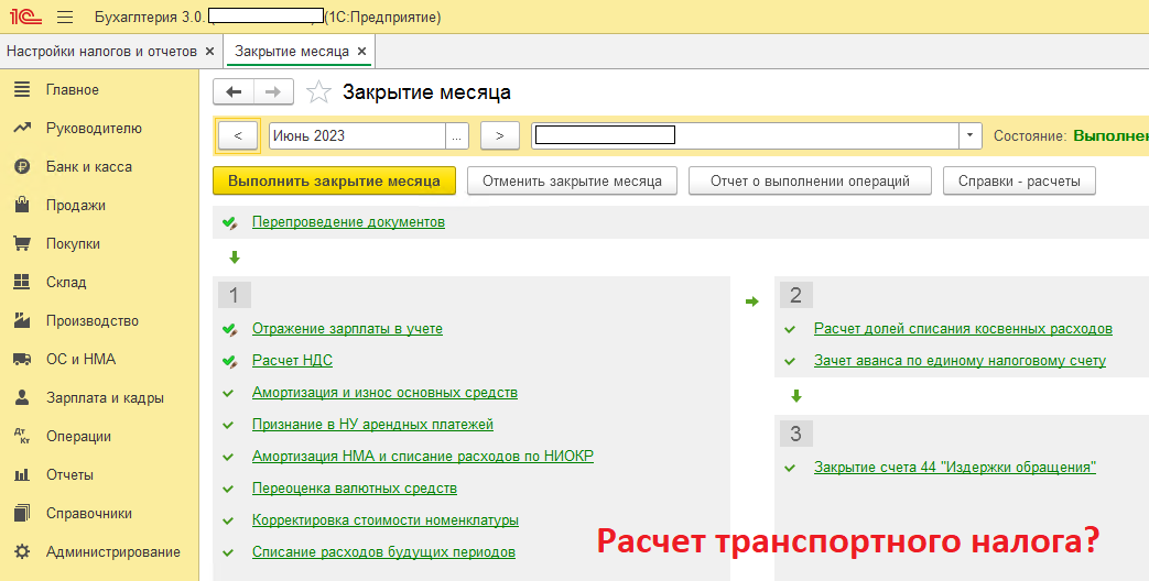 Именно с таким вопросом обратился ко мне один из бухгалтеров Покопавшись в ИТС, на просторах сети интернет. Я как обычно поднял себе копию базы, так сказать для экспериментов. И пошел смотреть 1. Основное средство введено в эксплуатацию 2. Амортизация рассчитывается Но странный момент. Где-то в роликах вижу что в обработке по закрытию месяца, я не вижу пункт "Расчет транспортного налога" Также согласно информации полученной из сети, иду Главная \ Налоги и отчеты Далее "Транспортный налог" Прошелся по ссылкам "Регистрация транспортных средств", информация ТС есть "Ставки" там всё вроде-бы как нормально, информация о размерах ставок тоже есть Далее перешел по гиперссылке "Уплата авансовых платежей" И увидел основную причину отсутствия пункта в закрытии месяца, пункта "Расчет транспортного налога" Выставляю этот флажок. Перехожу по следующей гиперссылке "Способы отражения расходов" Там не заполнены способы отражения расходов После заполнения способов отражения, возвращаюсь в обрабо