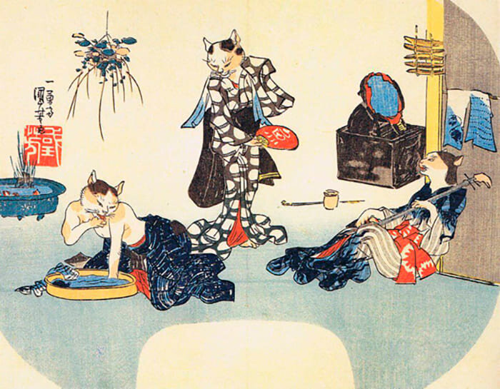 Утагава Куниёси (1798-1861) (не путать с Утагава Кунисада 😊) — один из крупнейших японских художников и мастеров цветной гравюры конца периода Эдо, представитель жанра укиё-э. Он начинал как художник-неудачник, живущий в постоянной нужде, но к концу жизни, став известным мастером, скопил значительное состояние, которое затем разделил среди своих учеников. Куниёси был страстным кошатником. По словам его учеников в мастерской художника везде бродили кошки, а в складках кимоно мастера уютно устраивался котёнок и мирно дремал, пока хозяин работал. В своем доме он даже установил алтарь для своей любимой умершей кошки. И своим студентам также всегда предлагал создавать образы кошек. Вот одна из его известных работ, состоящая из трёх гравюр, «Пятьдесят три кошачьих станций Токайдо» с изображением 55-ти кошачьих сценок, каждая из которых представляет станцию на главной дороге, соединяющей Киото и Токио. На гравюрах мы видим множество совершенно разных кошек, и все они заняты какими-то своим