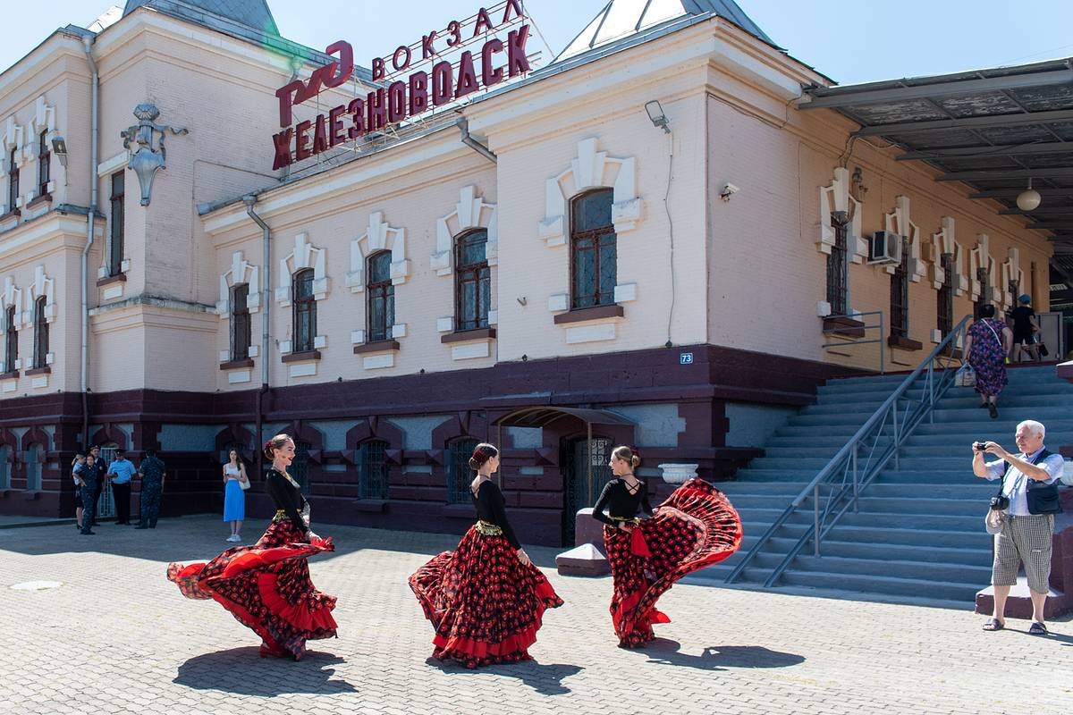 В Железноводске провели историческую реконструкцию «История курортного романа». В ставропольский город на один день «вернулись» дамы и кавалеры эпохи Сергея Есенина и Айседоры Дункан, отдыхавшие когда-то под сводами Пушкинской галереи. На улицах Железноводска воссоздали сцены отдыха водяного общества конца XIX — начала XX века, а гостей праздника угощали едой и напитками под звуки духового оркестра. Фото: Иван Губский/ТАСС