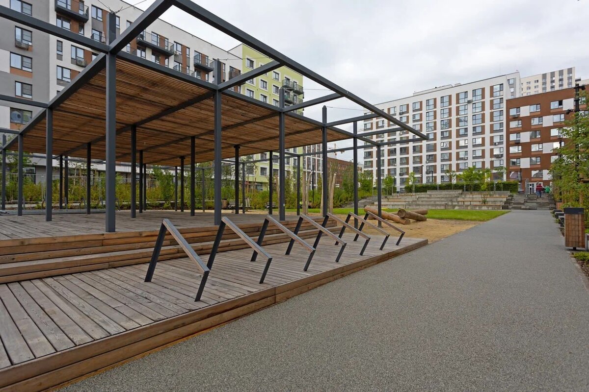 Сквер разбит на несколько площадок с учетом возраста и интересов жителей. Для взрослых установлены скамейки и деревянный подиум с перголами, на котором можно проводить занятия йогой и мастер-классы по рисованию, разместить теннисные столы и лежаки.