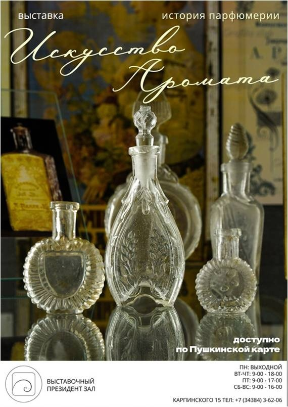флаконов духов XIX–ХХ веков, которые зачастую ценились не меньше, чем сам аромат. Элегантные формы стеклянных флаконов и оригинальные пробки могли многое рассказать о своем содержимом. В экспозиции представлены парфюмерные флаконы из фондов Краснотурьинского краеведческого музея и частной коллекции краеведа Евгения Заруднего. Дополнением к выставке выступают дамские аксессуары, реклама парфюмерной продукции XIX века, фотографии модников того времени, а также некоторые из компонентов, использовавшихся в искусстве создания ароматов.
