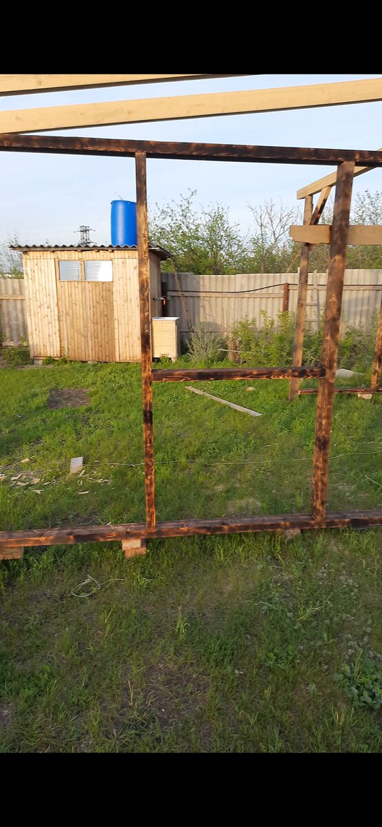 Всем привет. Вот каркас готов. Каркас уже довольно жёсткий и прочный, временно где то стоят уголки, стоят укосины. Всю древесину, за исключением основных столбов которые я залил отработкой, я решил обжегать из соображений защиты древесины а самое главное - красоты. И так, закупаю осб 9мм и поехали... По большей степени я снимал видео, которых как раз много у меня на канале, а эти фото это скрины из них. Обеденная и кухонная часть беседки у меня почти открыты, сплошные окна. Параллельно крашу осб снаружи в чёрный матовый цвет, хоть чёрный и будет более подвержен нагреву, но мне эта идея цвета очень понравилась и меня уже не остановить... В зоне танцпола сделал двойную большую дверь, по дальнейшей идее эта дверь будет выход к лужайке около бассейна, но это уже позже. И так же по такому же принципу делаю основную входную дверь. В дальнейшем она конечно будет улучшена. Покупаю москитную сетку, очень не дорого, благо друг оконщик и креплю изнутри на все окна. Какая красота Что бы