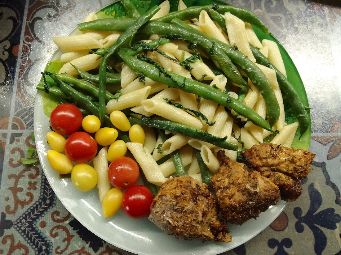 Вчера вечером сын появился на пороге дома с подружкой. Привез знакомиться. Хорошо мы шашлык днем жарили, правда оставалось уже совсем немного. А дети голодные, их парой кусочков мяса не накормишь. Время поджимает. Пришлось фантазировать, и я в очередной раз порадовалась тому, что живем в деревне, а вырастить на своей земле можно что угодно. Да и тем более август на дворе. Все плодоносит, все вкусное, сочное, все под рукой. Дочку попросила быстро отварить "макарошки", а сама сбегала на огород, нарвала спаржевой фасоли, шпината, помидор черри. Шпинат обжарила, фасоль вначале пару минут проварила, а потом добавила к шпинату. Смешала все с макаронами, положила рядом черри и остатки шашлыка. Вуаля! Подруга сына даже удивилась, как все быстро, вкусно и ярко. Ну а когда я заварила Иван-чай вместе с тимьяном и базиликом она в начале удивилась, потом с опаской сделав несколько глотков, потянула носом и пропела: "Какой аромат! Никогда такого вкусного чая не пила!" И правда, до чего сейчас на