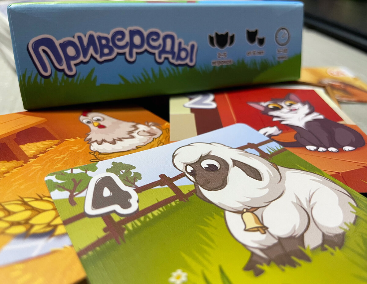 На прошедших выходных мы сыграли с Никой в «Приверед» — игру на счёт и скорость реакции, завёрнутую в милый фермерский сеттинг. Это малюсенькая коробочка с приятными на ощупь картами — и, кроме них, по факту игрового контента нет. Зато, кстати, что приятно, есть неигровой — в коробку вложены наклейки со всеми привередливыми персонажами настолки. Люблю такие комплименты от издателя — не отказалась бы от таких наклеечек во «взрослых» настолках ) Игра заявлена на возраст 6+, в неё можно играть составом от 2 до 5 участников, и мы с Никой сели сыграть пробные партии именно вдвоём. Сразу скажу, что в игре несколько, так скажем, уровней сложности, и мы играли на самом простом — он сводится по сути к «быстрее посчитать», и, как вы понимаете, в 33 ты считаешь немного лучше, чем в 6, поэтому честной конкуренции в игре не получилось. Особенно это хорошо иллюстрирует именно игра вдвоём с ребёнком: она скорее про то, что вы учите ребёнка анализировать ситуацию с больше-меньше и выбирать правильный