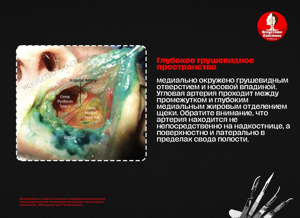 Глубокое грушевидное пространство проходит вглубь до угловой артерии и примыкает к углублению грушевидного отверстия. Больше интересного материала и исследований смотри в нашем канале по ссылке https://t.me/art_of_Plastic