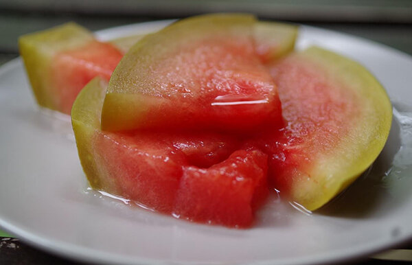 Недавно я приготовила маринованный арбуз в банке. Сделала его без чеснока, потому что мне не хотелось, чтобы он по вкусу напоминал маринованные огурцы. Уже через неделю он был вкусный – слегка кисловатый и игристый. А дело было так: перед отъездом на «длинные выходные» мне нужно было что-то сделать с арбузом, который мы не смогли съесть. Проще всего было замариновать со специями. Ингредиенты: Приготовление: Темный, зеленый слой кожуры я сняла овощечисткой, потому что это был обычный арбуз из магазина, и не всю грязь можно смыть с поверхности такой кожуры. Так что, подумала я, её лучше выбросить. Мякоть вместе с внутренним слоем кожуры разрезала на аккуратные кусочки, а затем поместила их в банку со специями. Что касается специй, то это был укропный зонтик, несколько кусочков корня хрена и немного душистого перца. Сверху оставалось немного неиспользованного места, поэтому я добавила несколько шариков светлого винограда. Залила все это холодным рассолом, приготовленным из расчета 30 грам