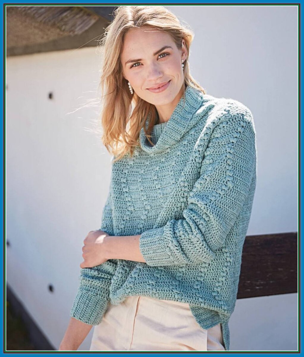Свитер крючком рельефным зигзагообразным узором из пышных столбиков (шишечек)