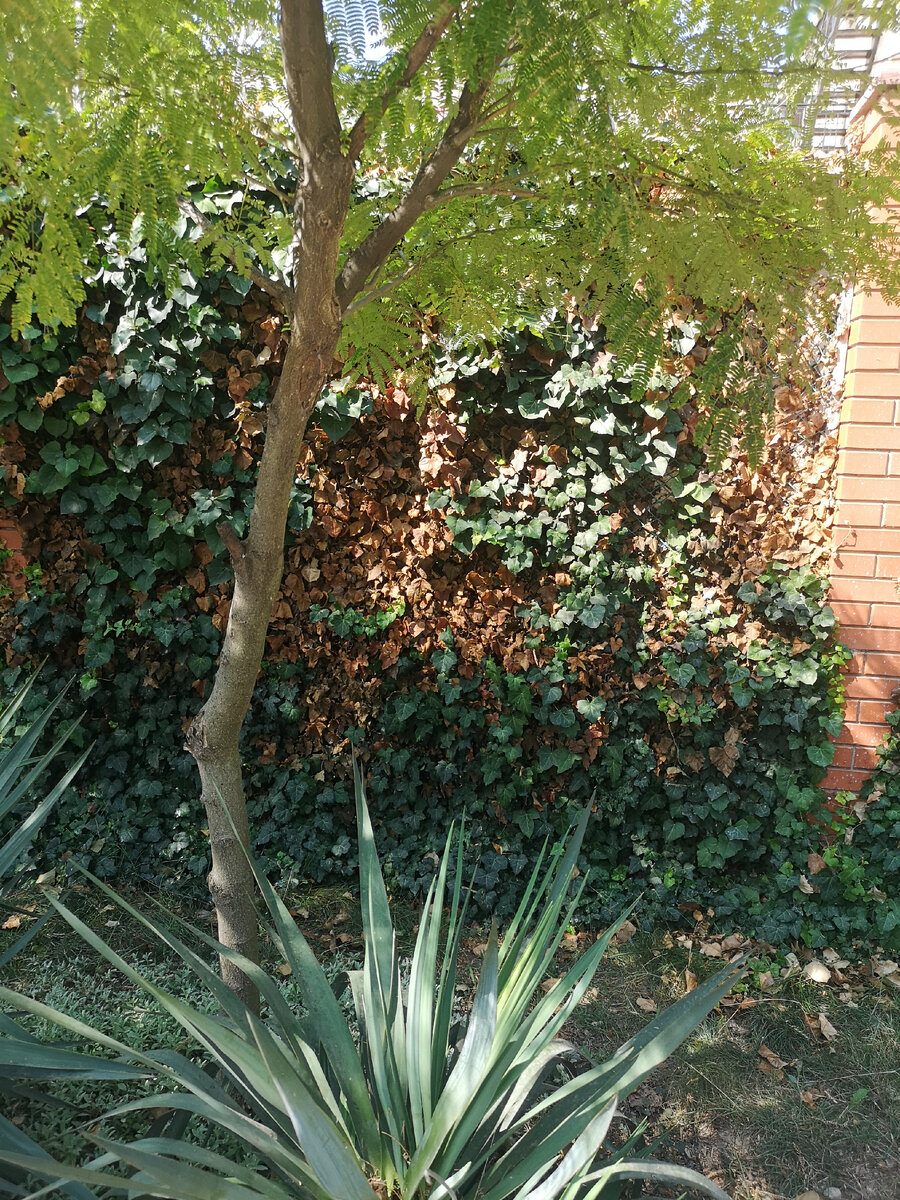 На фото вечнозеленый плющ, который очагами пожух. И так во многих местах. Я подобное вижу впервые у нас