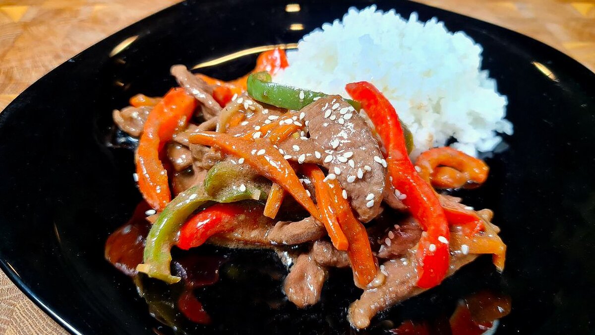 Говядина по-азиатски – это вкусное и интересное блюдо, которое состоит из мелконарезанной, сочной и нежной говядины с овощами на ваш выбор, я взял классический набор из перца, моркови и репчатого лука. Основной секрет приготовления данного блюда заключается в том, что говядину необходимо тонко нарезать, замариновать в белковом маринаде, а потом как можно быстрее обжарить на максимальном огне, тогда она будет сочная и нежная, при этом абсолютно не важно какой отруб вы будете использовать для приготовления. К тому же в этом блюде используются соевый и устричный соусы, вместе с чесноком и имбирём, благодаря этому, по вкусу, блюдо приобретает легко узнаваемые азиатские нотки. Рекомендую попробовать, это очень вкусно!