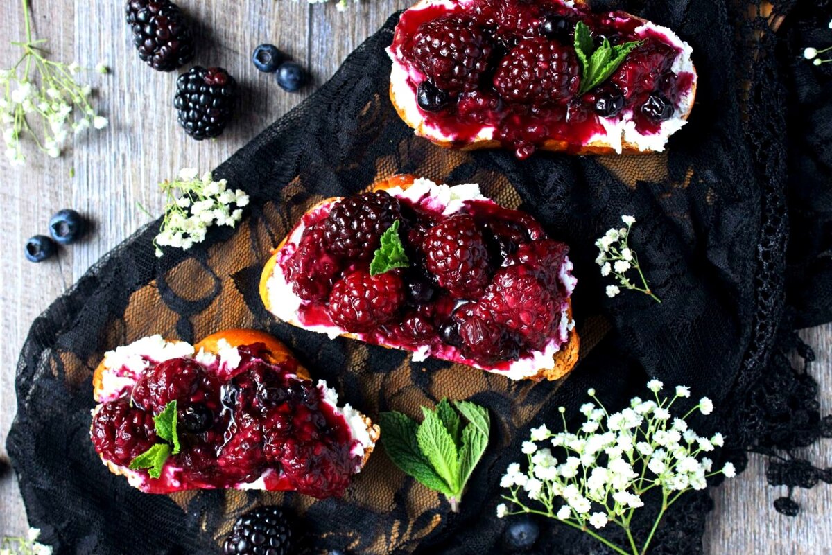 ИНГРЕДИЕНТЫ/8 ПОРЦИЙ: 1,5 чашки ежевики, 1/2 чашки черники, 1 ч.л ванили, 1,5 ст.л сахара, 3 ст.л воды, 1-2 ст.л просеянного кукурузного крахмала, 8 ломтиков хлеба на ваш выбор, 120 г козьего сыра, свежая мята.