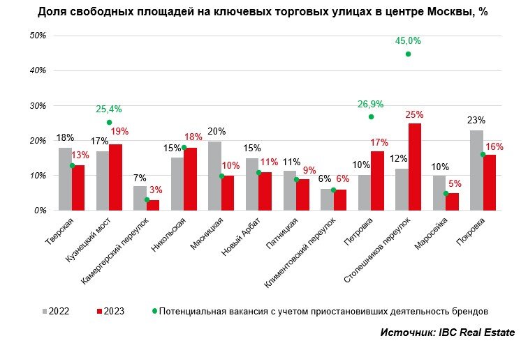 😞 Торговые улицы Москвы все-таки пустеют. Средний уровень вакантных помещений по центральным торговым коридорам уже 13%, в некоторых местах выше почти в 2 раза и это еще не предел Доля свободных площадей на Столешниковом переулке достигла 25% в августе (в прошлом году было 12%). Магазинов люксовой одежды и обуви все меньше и меньше. А по прогнозам IBC Real Estate в этом переулке может стать еще свободнее – до 45% свободных площадей. На других улицах не так печально, но тоже наблюдается рост вакансий: Кузнецкий мост, Никольская, Петровка. Где теперь одеваться админу?