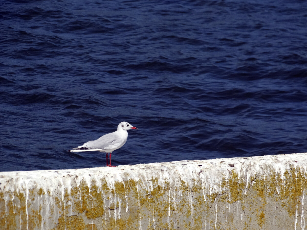 Итак, наш теплоход отошёл от причала и направился к шлюзу. На бетонном парапете причальной стенки нас встречала одинокая чайка.