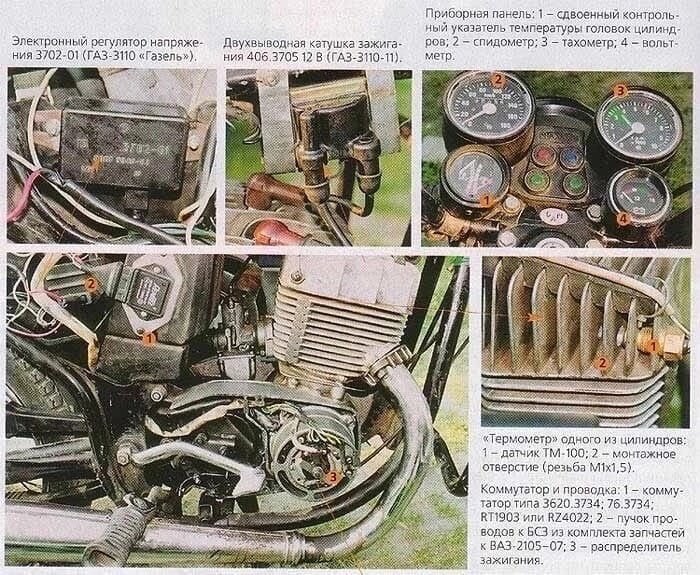 Мнение редакции: модификация мотоцикла, проведенная автором, вполне закономерна: контактное зажигание давно «просится на пенсию». В импортной мототехнике давно нет щелкающих реле в системе стабилизации напряжения питания. Система контроля температуры цилиндров полезна любому мотору, особенно она нужна склонным к излишнему нагреву тюнинговым версиям.