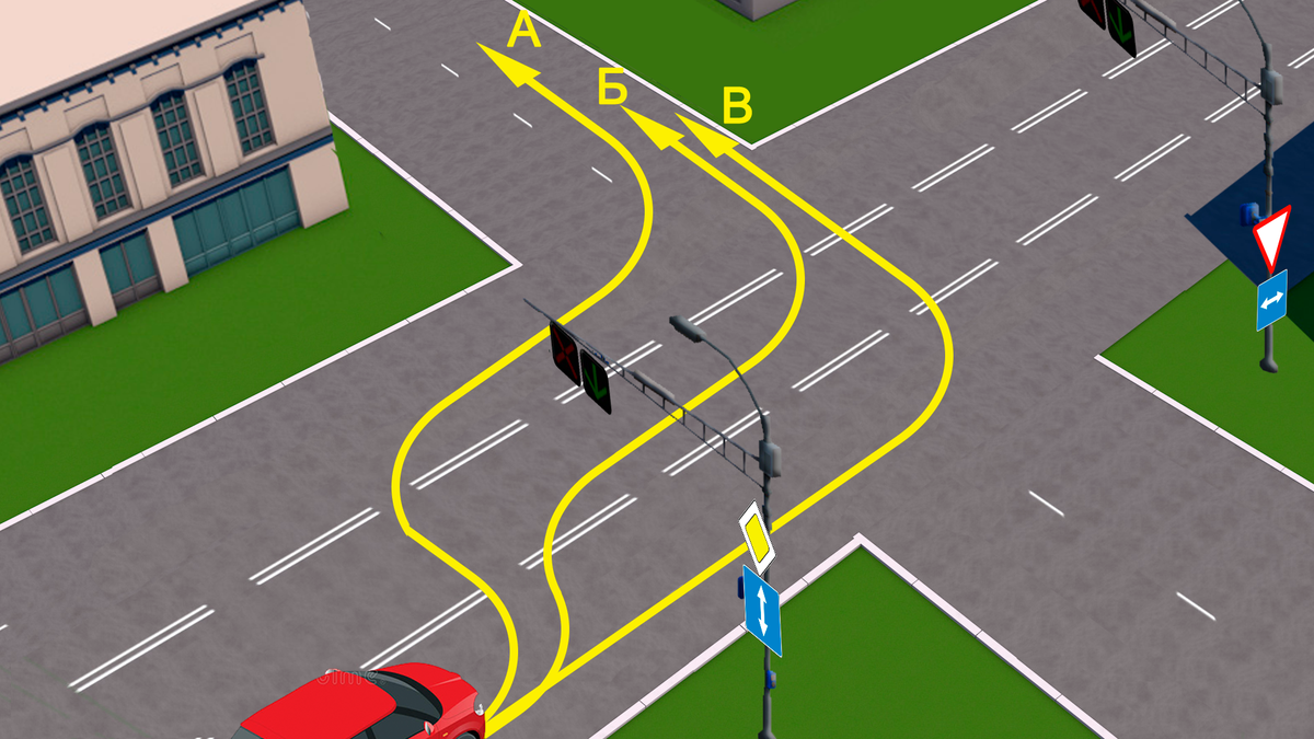 Повышаем уровень знаний правил дорожного движения. Друзья обратите внимание на перекресток. Он не простой, есть полоса с реверсивным движением. Вопрос. По какой траектории поедет красный автомобиль? Машина подъезжает к нерегулируемому перекрёстку. На дороге двухстороннее движение. Следовательно, поворачивать налево со встречной полосы по траектории А, запрещено. Реверсивная полоса посередине. Так как реверсивный светофор выключен, в средний ряд, в такой ситуации, выезжать нельзя. Правила запрещают использовать реверсивную полосу при выключенном реверсивном светофоре. Траектория Б так-же под запретом. Оставшаяся траектория В, разрешает поворот налево. Ответ. Разрешено только по траектории В. Спасибо за просмотр. Всем ровных и безопасных дорог. Прочитайте предыдущую задачу.