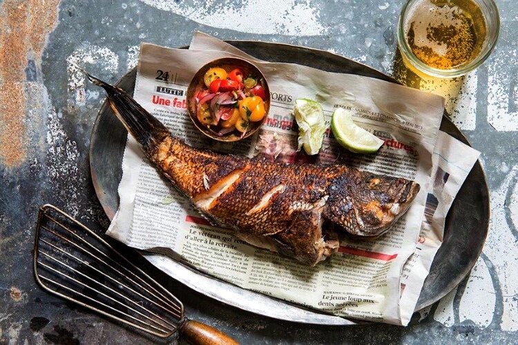 ИНГРЕДИЕНТЫ: 1 сибас (400-500 г), 1 огурец, четверть пучка лука, половина лайма, 2 ч.л тертого корня имбиря, 1 красный перец чили, 100 мл рыбного или светлого соевого соуса, 2 ст.л крахмала, растительное масло