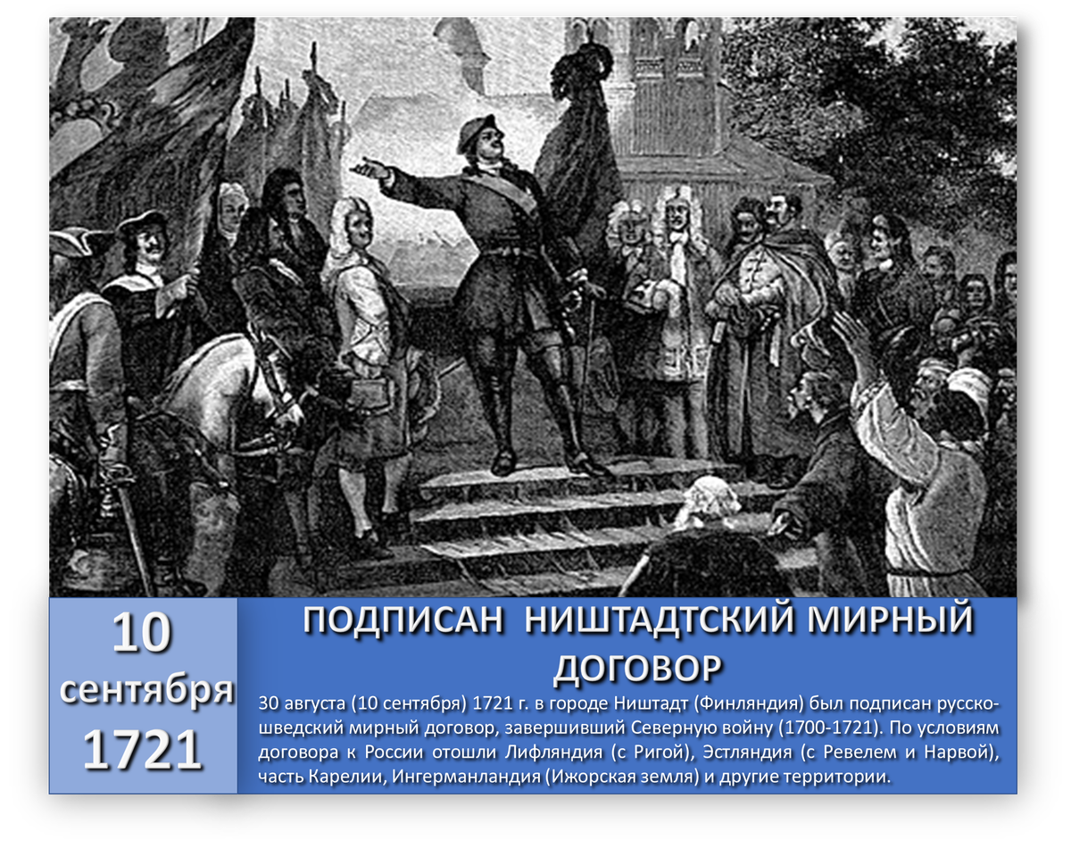 30 августа (10 сентября) 1721 г. в городе Ништадт (Финляндия) был подписан русско-шведский мирный договор, завершивший Северную войну (1700-1721).