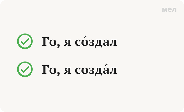 «Го, я создал», — говорят геймеры, когда зовут друг друга играть. Произнесите эту фразу вслух, а потом сверьтесь с нашей орфоэпической «Грамотностью». Правильно: создал (и допустимо — создал) Глагол «создать» — пример слова с подвижным ударением. В начальной форме оно стоит на первом слоге. Однако, если мы принимаемся изменять глагол по лицам и числам (а потом еще и по временам), ударение начинает свое «плавание». Спрягая глагол в настоящем и будущем временах, мы видим, что ударение остается на последнем слоге: создаю, создает, создаем, создам, создашь и так далее. А вот в прошедшем времени оно перемещается в начало слова: я создал, мы создали (исключение — форма создала). Впрочем, формы создал, создали словари уже тоже фиксируют как допустимые разговорные варианты. Но строгой литературной норме, которой необходимо придерживаться в официальной речи, соответствует все же вариант с ударением на первом слоге. Еще больше веселых и полезных карточек о русском языке — в «Грамотности» на «Мел