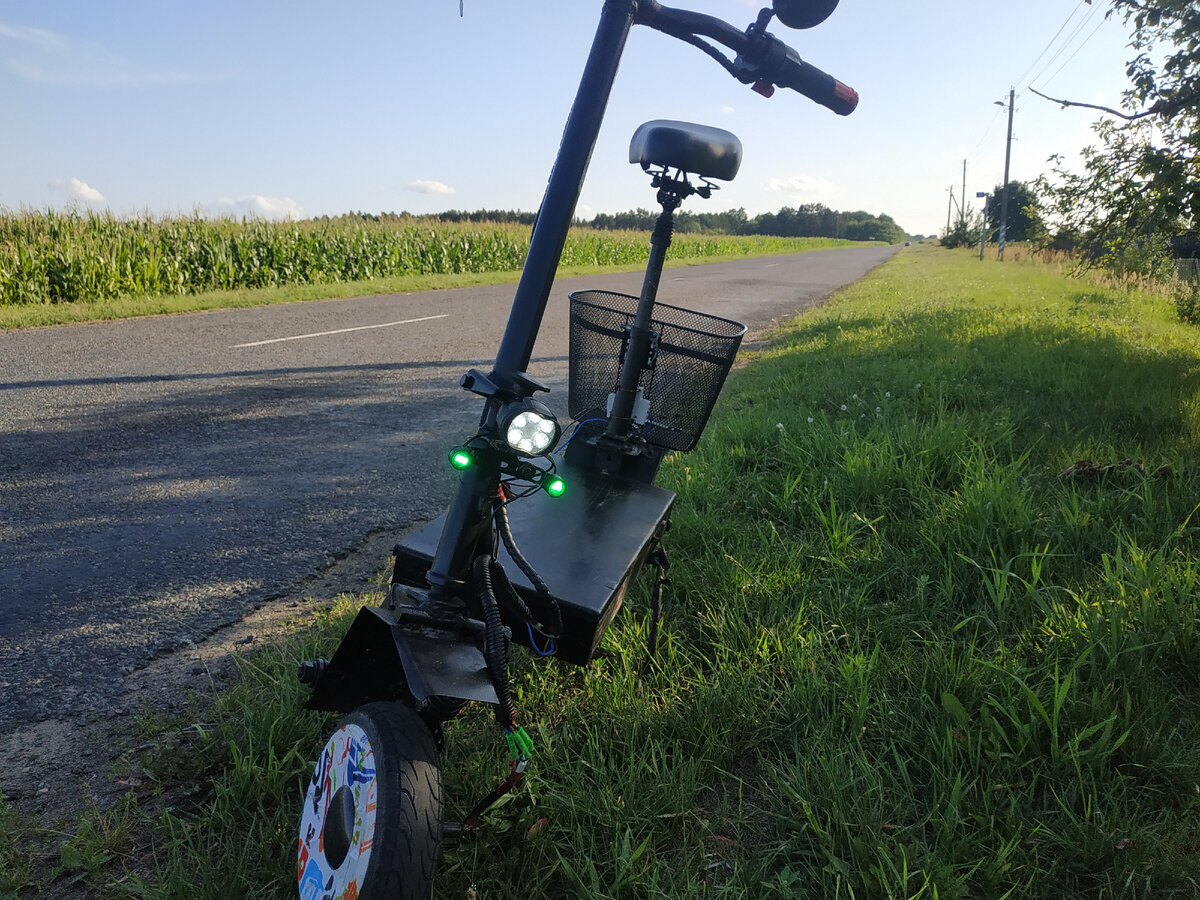 Это мой самодельный электро самокат. Сделан на базе гироскутера - рама полностью самодельная с металолома. Мозги пепепрошиты под два ведущих колеса.