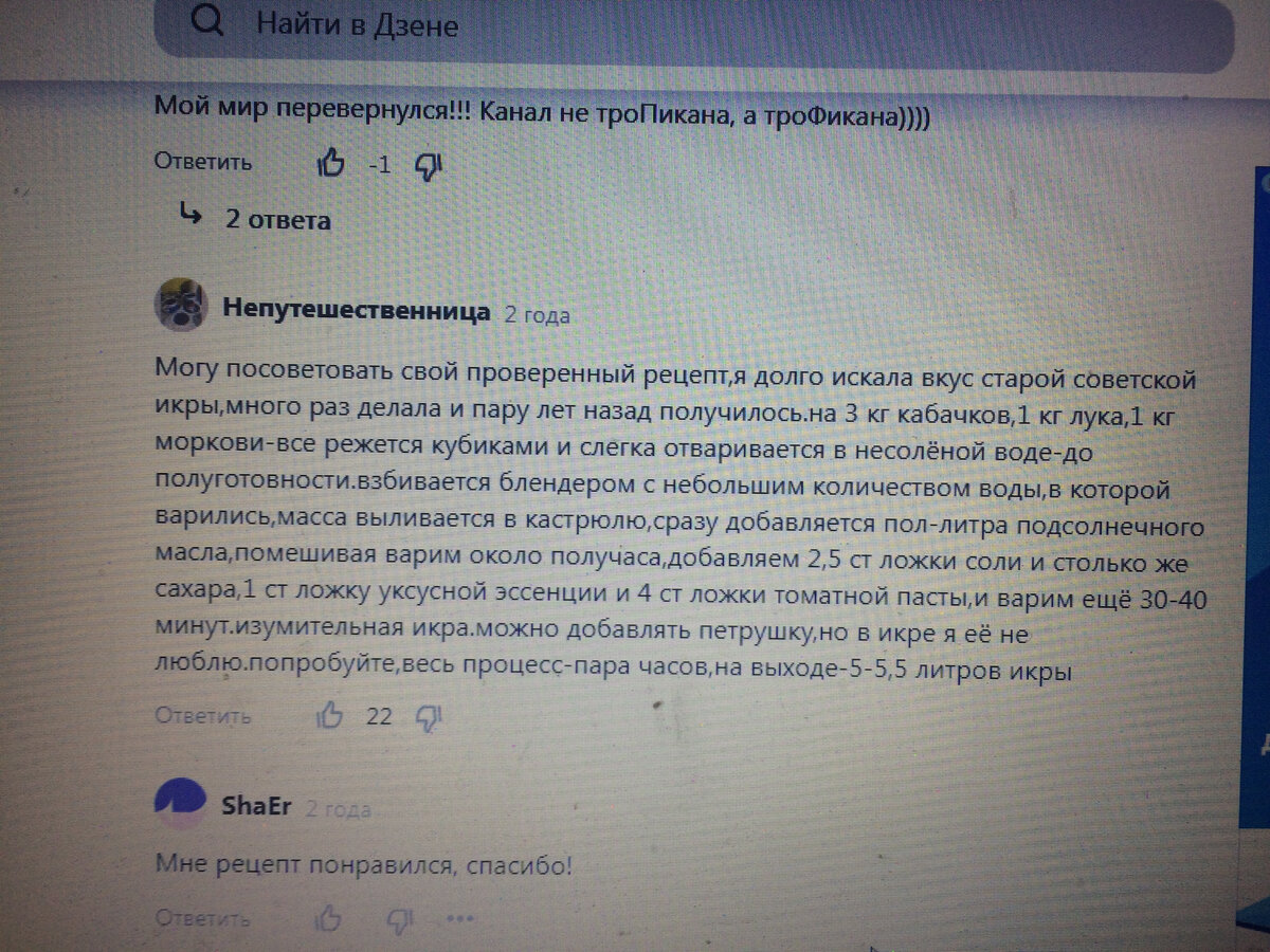 Почему я сделала акцент на то, что канала на Дзене нет, - всё просто. Вспомните сами, сколько раз можно увидеть заголовок, что икра "как в советское время". А зачастую авторы этих каналов даже не готовят сами рецепты. Просто в силу того, что столько "жрачки" банально не нужно. Копируют рецепты из старых книг и журналов, или с чужих каналов. Этих рецептов масса. А потом делают яркие заголовки. типа "как в СССР", намекая на то, что продукт натуральный и качественный. А нет канала - значит точно она не заинтересована в привлечении внимания и на самом деле делала по этому рецепту не раз и ей он понравился. По-этому я не особенно доверяю тематическим кулинарным каналам и в основном сама стараюсь найти рецепт там, где кулинария - не основная тема канала, а второстепенная. На мой взгляд в таких каналах рецепты по крайней мере пробуют сами авторы. Далее совсем по теме: