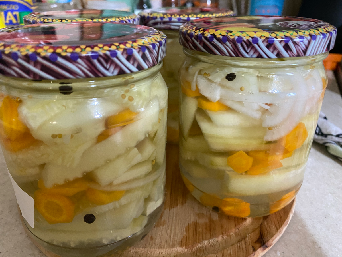 Думаю, многие сталкивались с такой проблемой... Вроде смотришь - смотришь, собираешь огурцы, а опять есть переростки... А если чуть подольше перерыв со сбором урожая - то вообще беда. Что с ними делать? Куда использовать? У меня есть несколько проверенных рецептов заготовок на зиму для таких переростков :-) Хочу с Вами поделиться. Сегодня расскажу про рецепт "Огурцы по-венгерски" Не спрашивайте откуда такое название, у меня никаких ассоциаций с Венгрией и таким рецептом нет. Нашла такой вариант на просторах интернета. В общем-то все максимально просто. Три основных ингредиента - огурцы, морковь и лук. Беру 2,2 кг очищенных огурцов - переростков и режу их дольками. Можно кружочками - кому как нравится. 6 морковок мелких, либо 3 крупных чищу и нарезаю кружочками. Одну большую луковицу режу тоненьким полукольцами. Затем все укладываю в стерилизованные банки слоями. Слой огурцов, морковь, лук, опять огурцы и т.д. Затем готовлю маринад. На 1,8 литра воды беру 30 горошинок перца черного, 2 ч