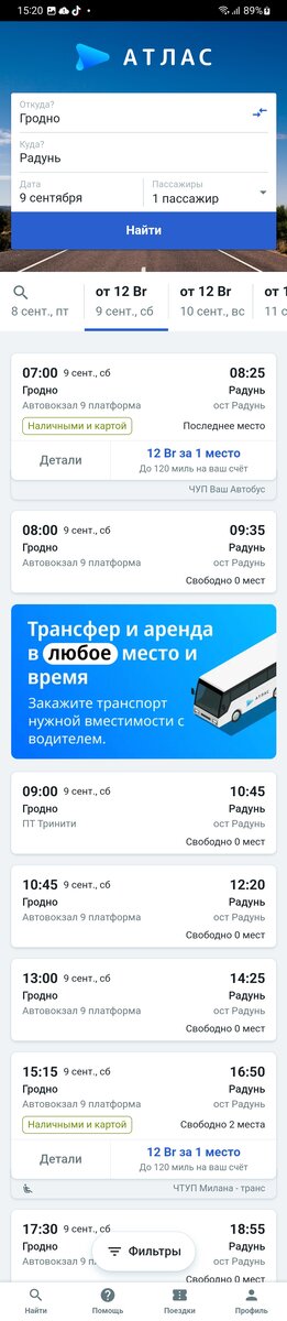 Вообще я не люблю маршрутки, потому что более удобны и безопасны поезда, но к сожалению по нужному мне маршруту поездов нет. Зато маршруток море, как и хитропопых людей, которые бронируют места для отправления в разное время, а в последний момент отказываются(водители рассказали). Теряют здесь и перевозчики и пассажиры, которые в приложении видят ноль свободных мест. Слабый человек скажет: "в чём проблема?купите себе машину и ездите. " А умный решает проблемы умом, но никак не деньгами, поэтому я уже отправил в атлас обращение. К тому же купить б/у автомобиль - купить кота в мешке и потратить гораздо больше, боясь остановиться в дороге ( в моей семье бывало такое не раз) и ещё кидать там же эту калымагу нельзя, а эвакуатор стоит как такси за сотню километров. А новый автомобиль не покарману, а пахать круглосуточно на железяку смысла не вижу. Что вы думаете по этому поводу?