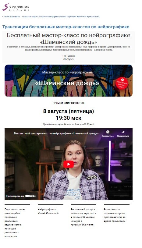 Организатор бесплатного Мастер класса по нейрографике по теме "Шаманский дождь" : Художник Онлайн Узнала я об мастер классе из рассылки. Открыла почту после отдыха на юге и вижу приглашение. Вот так оно выглядит Листайте галерею Прошла все процедуры (они простые) участия и ждала намеченного времени. 8 августа 2023 в 19-30 прослушала мастер класс. А вот рисовать стала на следующий день в субботу. И сразу после этого оформила эту статью. Урок ведёт Юлия Козинова. Она постоянный ведущий учитель школы Художник Онлайн. Я прошла с ней несколько мастер классов бесплатно Настало время прорисовать Шаманский дождь. Это возможность включить себя в процессы зарождения зерен личных намерений. Чтобы меньше было тревог, живя в больших и малых городах, где связь с природой и космосом невелика. Приходят моменты проблемы со здоровьем, задаешь себе вопросы, что дальше. Один из вариантов нарисовать и продумать тему Шаманский дождь Придумал его Пискарев П.М. Слушаем Юлию : Психическая доминанта в этой т