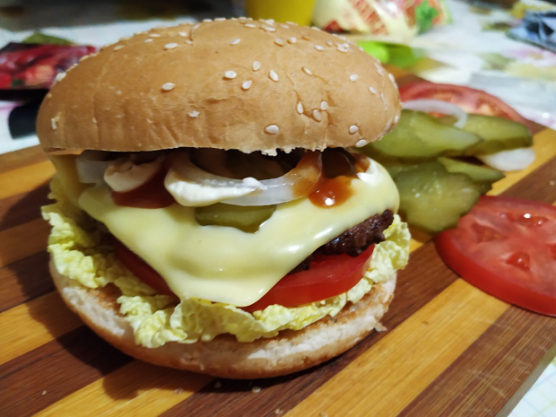 В те не такие уж далёкие времена не так просто было отказаться от сдобной булочки с котлетой внутри за чистым пластиковым столиком, да ещё запить это «лакомство» кока-колой в красивом фирменном стаканчике. Расскажем, как дома приготовить гамбургер, вкуснее, чем в Макдоналдсе. Сложного в этом нет ничего — бутерброд, он и есть бутерброд, пусть даже с котлетой. Для приготовления гамбургеров вам понадобится: мясо (телятина, нежирная свинина), молоко, белый хлеб, солёный огурец, помидор, листья салата, плавленый сыр, майонез, соль, ну и, конечно, готовые булочки для гамбургеров. Вначале размачиваем в тёплом молоке белый хлеб и проворачиваем его вместе с мясом в мясорубке. Фарш солим, перемешиваем и формируем из него небольшие плоские котлетки. Это удобно сделать, полож